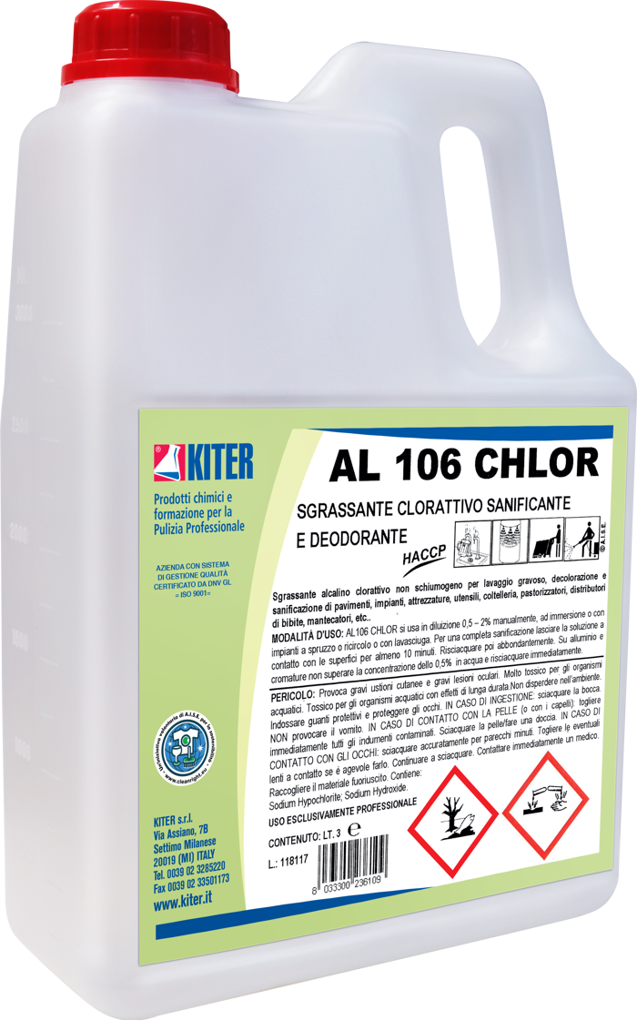 AL 106 CHLOR è un clorodetergente alcalino non schiumogeno, indicato per una sanificazione profonda di superfici, attrezzature e pavimenti in ambito alimentare, ospedaliero e collettivo. Svolge un’azione battericida, fungicida e virucida, rimuovendo residui grassi, organici e carboniosi. Idoneo per uso professionale, garantisce igiene e sicurezza come previsto dalle procedure HACCP. Utilizzare con dispositivi di protezione individuale.