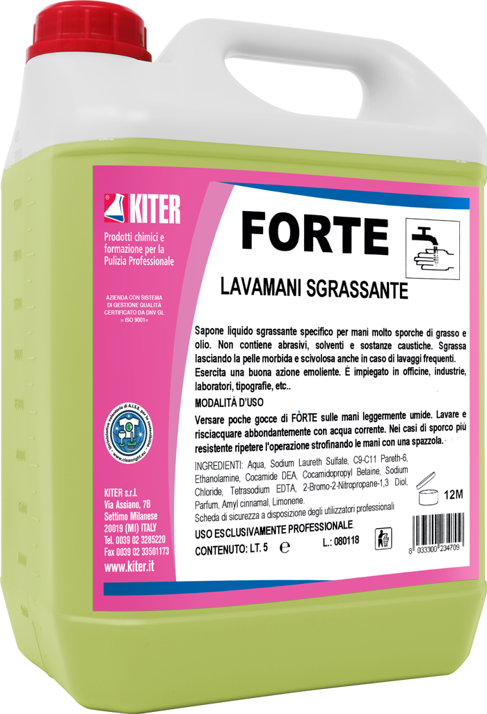FORTE KITER è un sapone liquido sgrassante ideale per mani molto sporche di grasso e olio. Indicato per uso professionale in officine, industrie e ambienti con sostanze oleose, pulisce a fondo senza danneggiare la pelle. Privo di abrasivi e solventi aggressivi, lascia le mani morbide anche con lavaggi frequenti. Gradevole profumo fiorito. Fornito in tanica da 5 litri. Conforme ai requisiti UE per i prodotti cosmetici.
