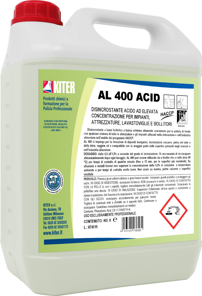 AL 400 Tanica kg 6 è un detergente acido concentrato specifico per uso professionale. Garantisce la rimozione efficace di incrostazioni vecchie e persistenti da grassi, graffiti, vernici, sporco atmosferico, gomme e colle su superfici lavabili. Indicato per acciaio inox, plastica, gres, cemento e utilizzi in ristorazione, impianti e industrie alimentari. Non idoneo su marmo e superfici smaltate. Adatto a varie modalità d’applicazione. Da usare con dispositivi di protezione.