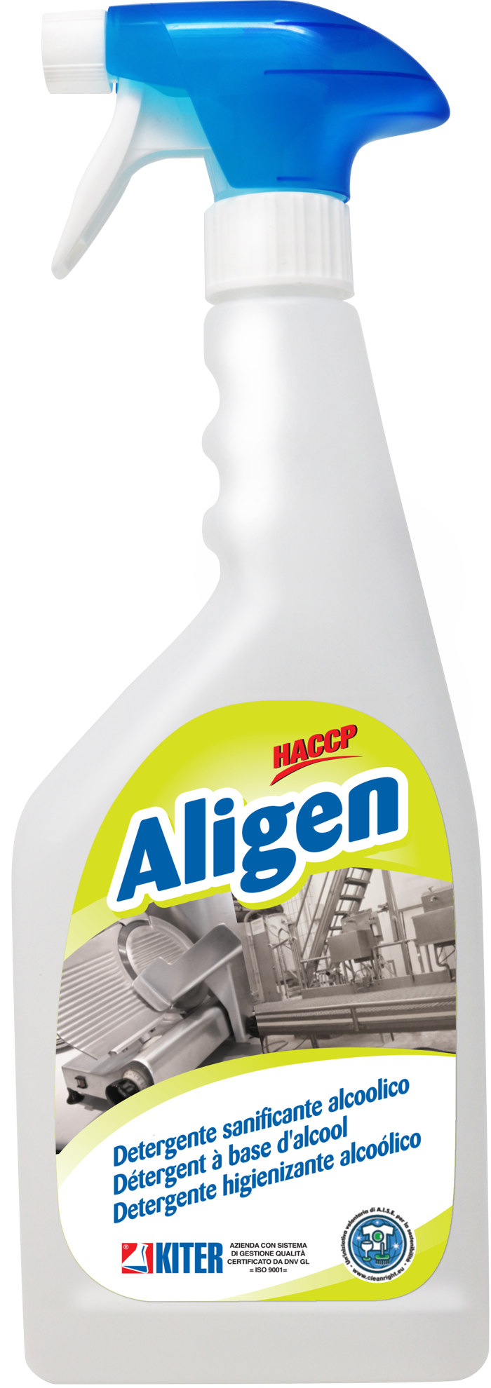 ALIGEN è uno sgrassante igienizzante universale senza risciacquo, studiato per la rimozione istantanea di sporchi stratificati, unto, grasso, inchiostri, pennarelli, graffiti e residui carboniosi. Ideale per superfici e attrezzature in ambito alimentare e HACCP, asciuga rapidamente senza lasciare aloni. Formulato senza profumi né coloranti, può essere impiegato anche per la pulizia di celle frigorifere fino a -15°C. Solo per uso professionale.