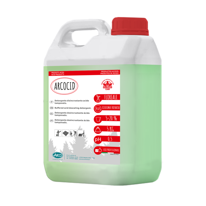ARCOCID è un detergente acido tamponato a base di acido fosforico dedicato all’uso professionale. Rimuove incrostazioni calcaree e residui organici su pavimenti in ceramica, grès, pareti e facciate. Garantisce risultati ottimali in una sola operazione con schiuma ridotta. Ideale per la manutenzione di superfici in ambito industriale, la tanica da 5 kg assicura praticità ed efficacia nella pulizia quotidiana. Uso riservato a personale qualificato.