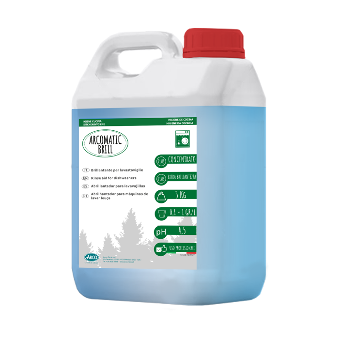 ARCOMATIC BRILL tanica 5 kg è un brillantante acido liquido per lavastoviglie professionali. Grazie ai tensioattivi a bassa schiuma, favorisce l’asciugatura rapida delle stoviglie e garantisce risultati ottimali anche con diverse durezze dell’acqua. Indicato per impianti di dosaggio automatico, agisce già a partire da 80°C. Il prodotto è conforme alle normative vigenti, ideale per un uso sicuro ed efficiente nella ristorazione.