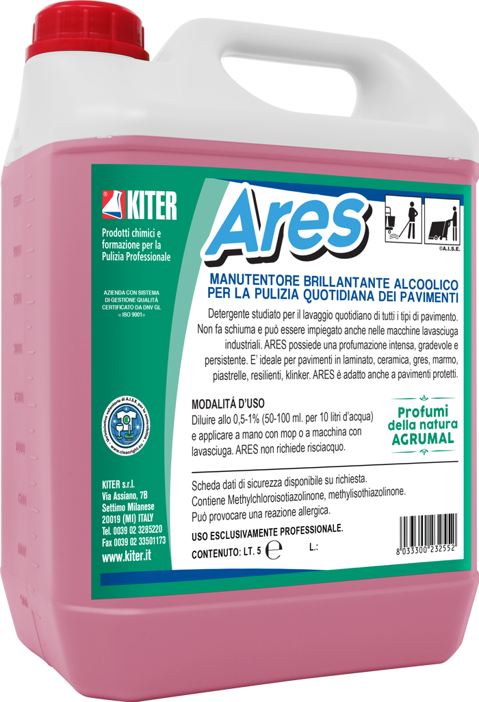 ARES è il detergente sgrassante ideale per la pulizia frequente di superfici molto sporche. Proposto in tanica da 5 litri, rimuove rapidamente lo sporco ostinato da pavimenti e rivestimenti senza lasciare aloni né necessitare risciacquo. La sua formula a bassa schiuma è perfetta per lavasciuga industriali. Lascia un duraturo profumo agrumato e rende ogni ambiente pulito e brillante. Indicato per uso professionale in collettività e ambienti pubblici.