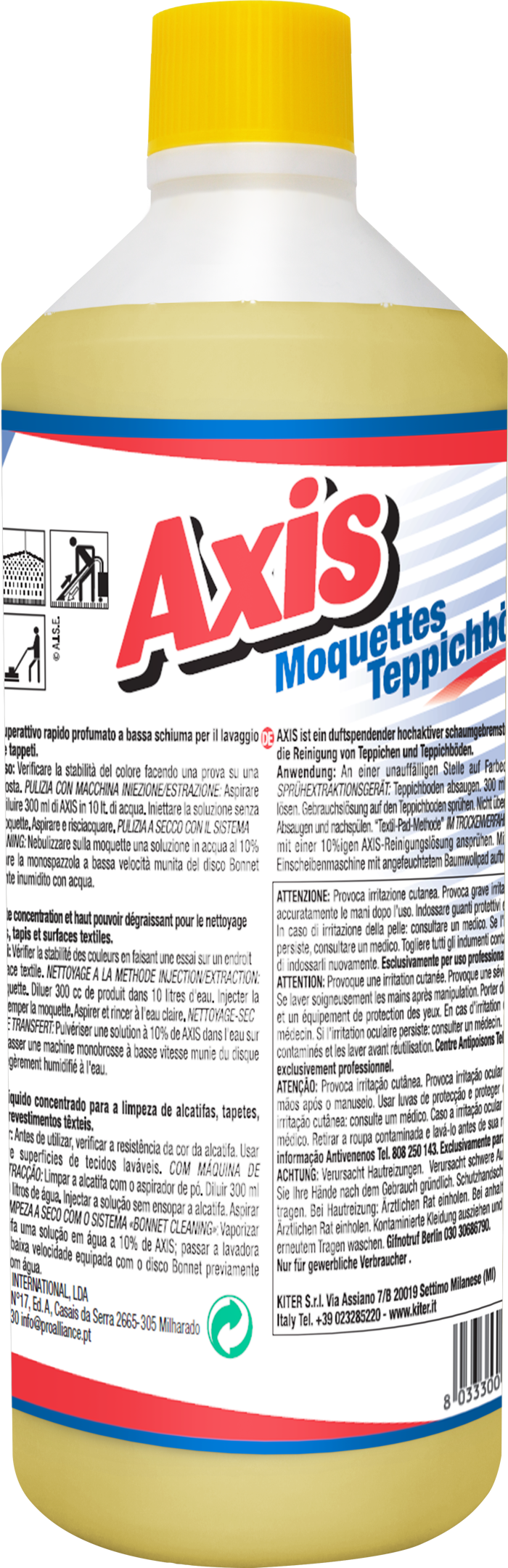 AXIS è un detergente professionale a bassa schiuma specifico per la pulizia profonda di moquette, tappeti e tappezzerie con macchine a iniezione/estrazione o sistema Bonnet. Ravviva i colori, lascia un profumo floreale persistente e si asciuga rapidamente. Non lascia residui, protegge dalle ricontaminazioni e non incrosta le attrezzature. Consigliato per rivestimenti in fibra sintetica. Uso riservato a professionisti con dispositivi di protezione.