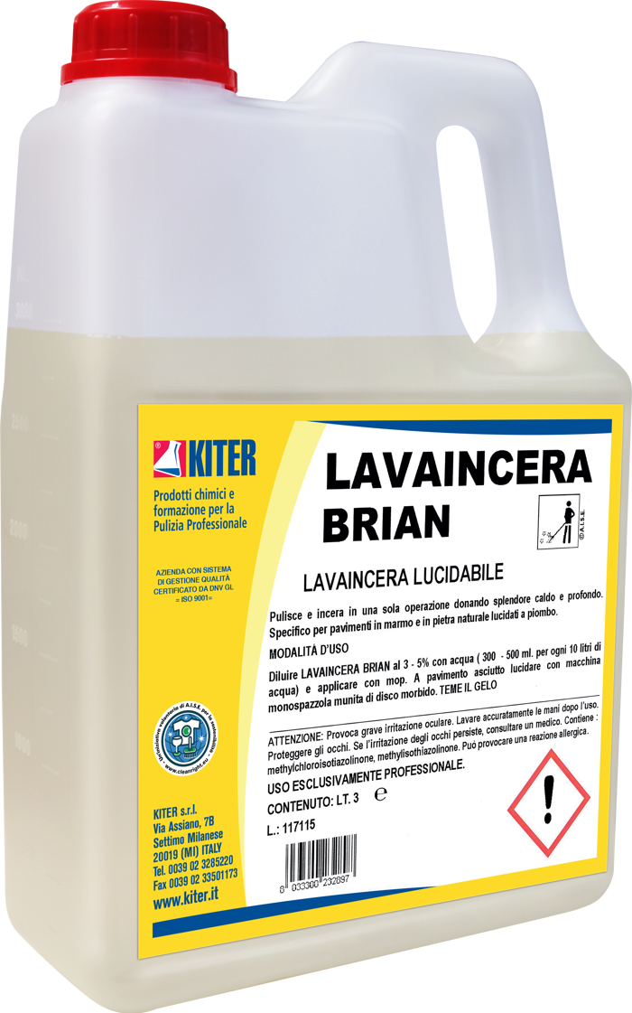 BRIAN LAVAINCERA tan.lt.3 è una speciale emulsione lucidabile per la manutenzione rapida e il ripristino di superfici trattate a cera. Indicato per pavimenti in marmo e pietre dure, pulisce e rinnova la brillantezza in un’unica fase. Va diluito dal 3 al 5 percento, applicato con mop o panno e lucidato a secco. Profumato, facilmente miscibile in acqua. Utilizzare solo in ambito professionale evitando il contatto diretto con occhi e pelle.