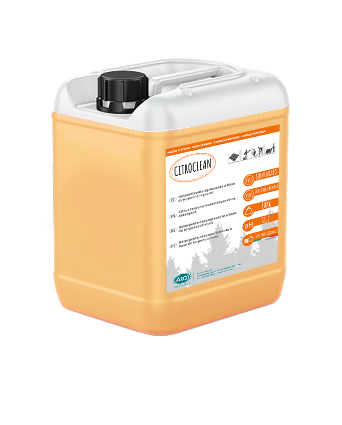 CITROCLEAN è un detersolvente sgrassante a base di terpeni d’arancia ideale per la pulizia di fondo di pavimenti e la rimozione di grassi, oli, lubrificanti e catrame. Indicato anche nell’industria alimentare per cappe, filtri e superfici molto unte, garantisce efficacia grazie all’azione naturale degli agrumi. Diluito in acqua, forma un’emulsione priva di schiuma che si adatta alle macchine lavasciuga. Per uso esclusivamente professionale.