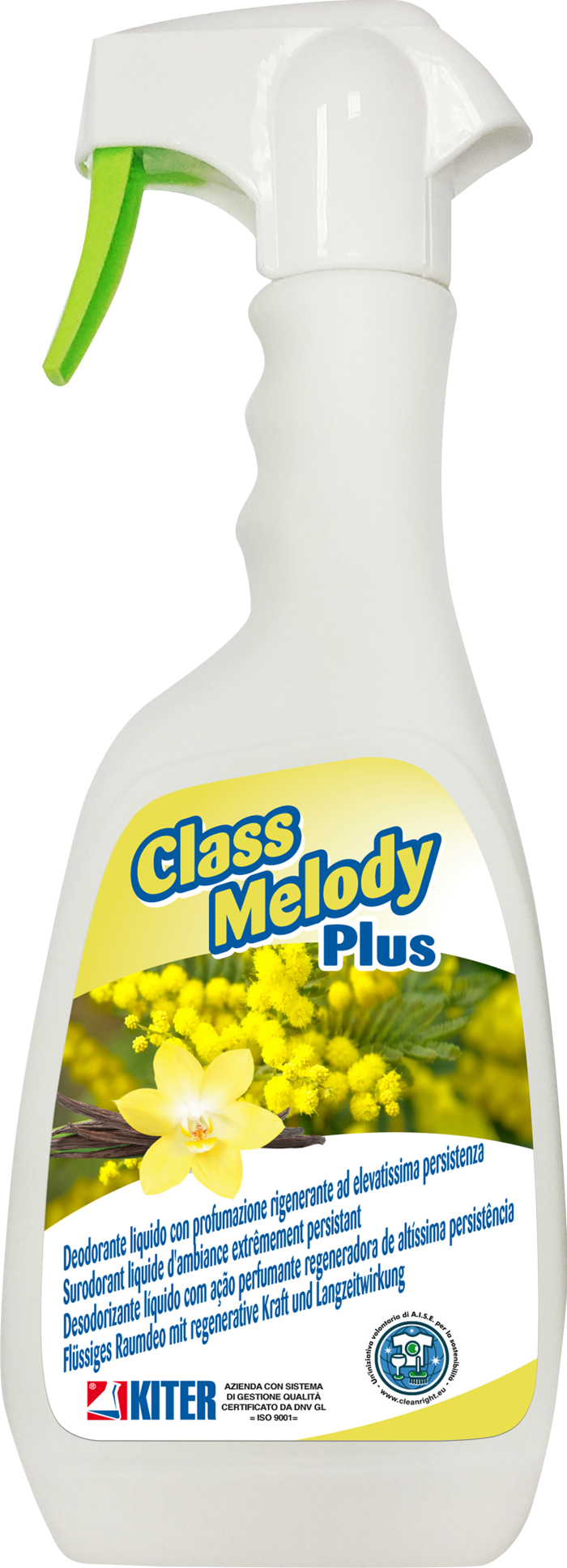 Class Melody Plus è un deodorante per ambienti ultraconcentrato con nota Elegance, ideale per ambienti professionali. Grazie alla sinergia di mimosa e vaniglia diffonde una fragranza fresca e persistente. Il flacone da 500 ml è dotato di nebulizzatore micro per una distribuzione efficace e consumi contenuti. Utilizzare solo in aree nascoste, evitando arredi e tessuti. Destinato a uso professionale.