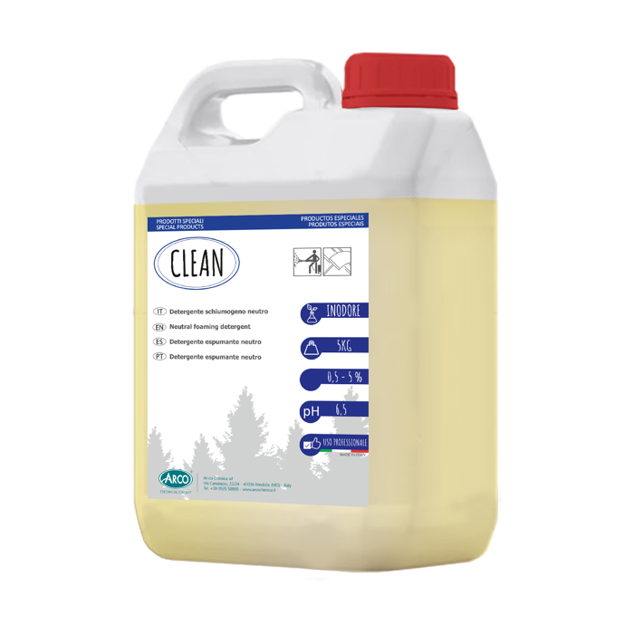 DETERGENTE SCHIUMOGENO NEUTRO INODORE Detergente schiumogeno neutro concentrato a forte effetto emulsionante dello sporco tenace. E' usato per pulizie straordinarie di attrezzature di industrie alimentari dove è indispensabile l'uso di prodotti neutri e inodori. Trova largo impiego per la pulizia (sgrossatura) di affettatrici, banchi da lavoro, tritacarne e attrezzature di ogni tipo e di ogni materiale. L'effetto sgrassante e brillantante di CLEAN permette una perfetta pulizia di vetrate con il metodo a stecca. Si usa come shampoo per il lavaggio di autovetture in generale.
