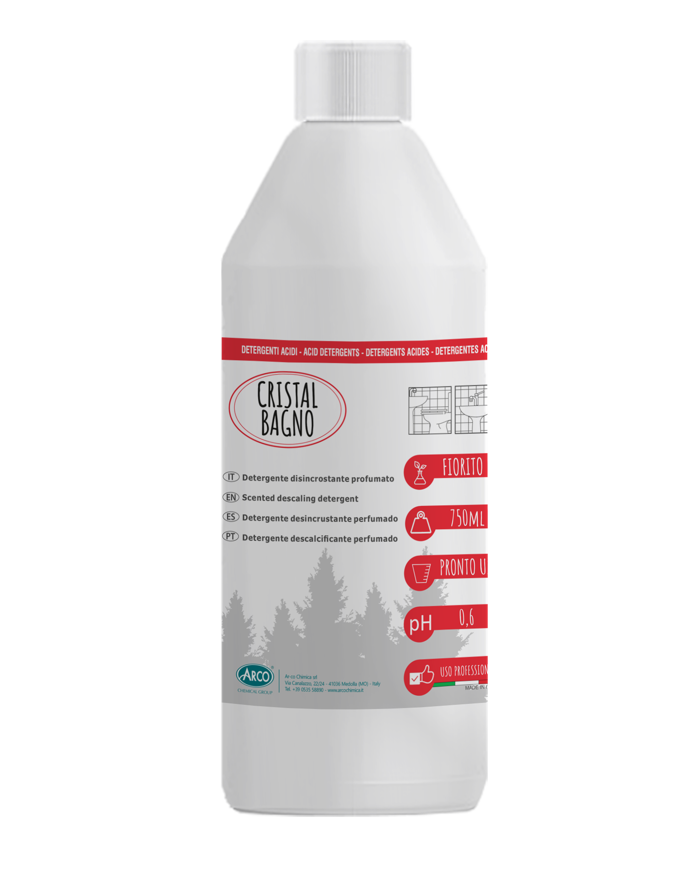 DETERGENTE DISINCROSTANTE ACIDO IN GEL •CRISTAL BAGNO e' un detergente acido in gel a base fosforica adatto per la rimozione dello sporco calcareo misto a residui saponosi. Ideale per la pulizia di sanitari, docce, bidet, lavabi, box doccia e piastrelle, lasciando le superfici brillanti esaltando il lucido delle rubinetterie. •CRISTAL BAGNO ha una profumazione di nota fiorita.