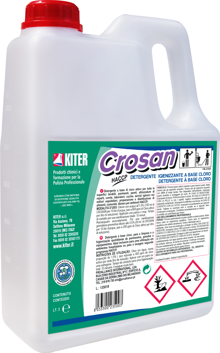 CROSAN è un detergente igienizzante a base di cloro attivo, ideale per la sanificazione quotidiana di tutte le superfici lavabili nei settori ospedaliero e alimentare. Indicato per pavimenti, pareti, attrezzature e cucine, garantisce efficacia e sicurezza. Uso esclusivamente professionale. Evitare il contatto con pelle e occhi. Confezione da 3 litri. Da impiegare con i dispositivi di protezione individuale previsti. Tenere lontano da fonti di calore e luce solare.