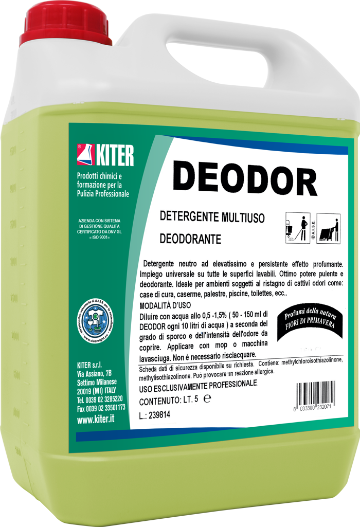 DEODOR è un detergente neutro multiuso profumato ai fiori di primavera, ideale per la pulizia quotidiana di tutte le superfici dure. Indicato per ambienti esposti a cattivi odori come comunità, case di cura, spogliatoi e toilettes. Sgrassa a fondo senza lasciare residui e diffonde una profumazione intensa e persistente. Non richiede risciacquo alle diluizioni consigliate. Formato professionale in tanica da 5 litri, particolarmente adatto per l’uso in grandi spazi.