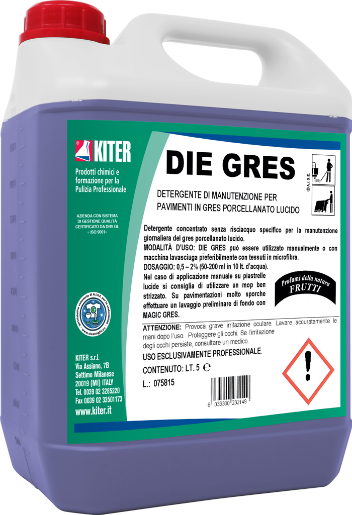 Die Gres tanica da 5 litri è un detergente concentrato ad acidità controllata ideale per la pulizia quotidiana di gres porcellanato lucido o opaco, ceramica, granito e pietre silicee. Rimuove sporco e residui calcarei senza lasciare aloni, garantendo superfici pulite e brillanti. Rapida evaporazione, non necessita risciacquo. Lascia un gradevole profumo fruttato. Per uso professionale. Da utilizzare con mop o macchina lavasciuga.