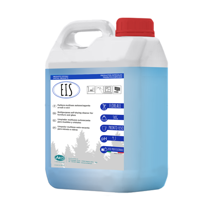 DETERGENTE MULTIUSO AUTOASCIUGANTE EIS è un detergente auto asciugante profumato per una veloce pulizia delle superfici quali: vetri,specchi,scrivanie,laminati plastici,superfici laccate,telefoni,computer ecc. EIS non necessita di risciacquo durante le operazioni di manutenzione giornaliera,su segni di biro,pennarelli e macchie di unto in genere. EIS ha una profumazione alla nota fiorita.