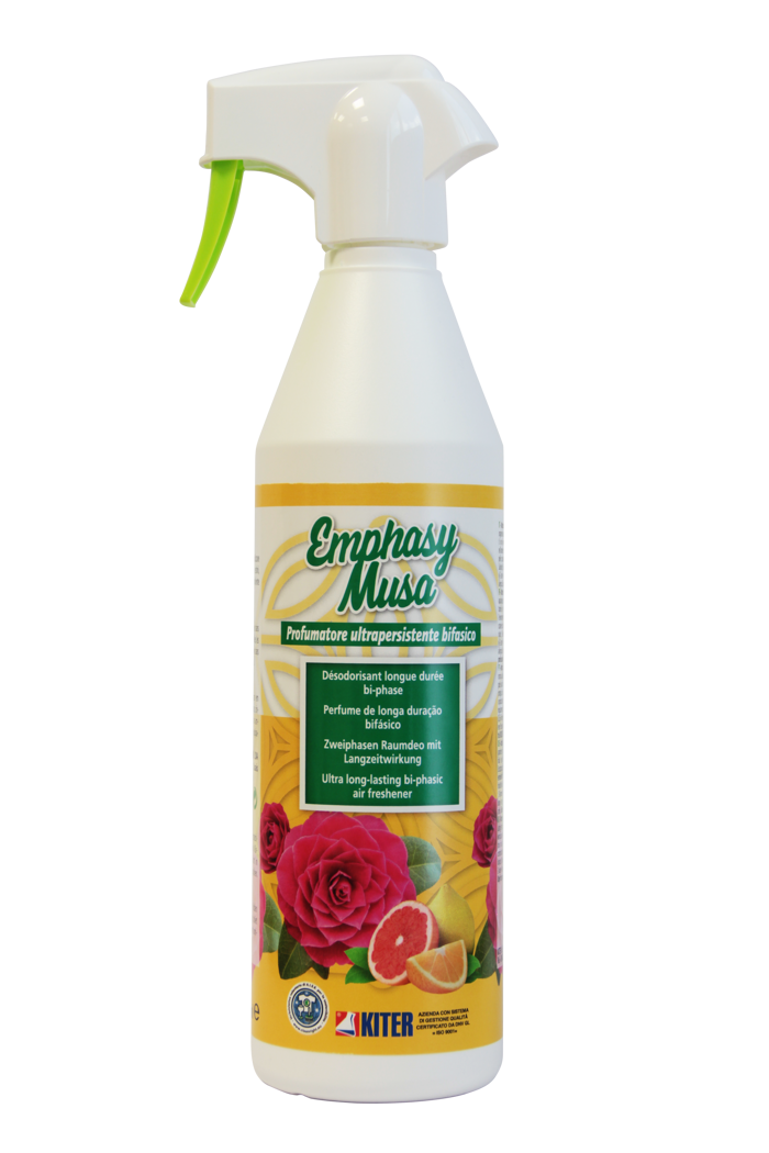 Emphasy Musa è un profumatore bifasico ad alta concentrazione, privo di tensioattivi e solventi. Garantisce una fragranza persistente di camelia e agrumi fino a 4 giorni e neutralizza efficacemente i cattivi odori. Ideale per ambienti professionali e in abbinamento al detergente pavimenti Musa SC. Grazie alla micro-nebulizzazione, assicura una diffusione uniforme e un consumo estremamente ridotto. Agitare prima dell’uso. Solo per uso professionale.