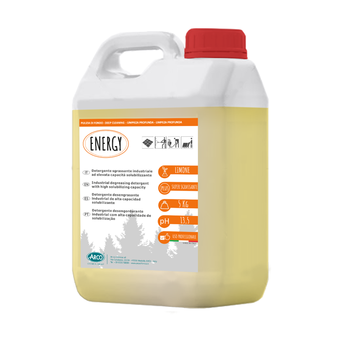 DETERGENTE SGRASSANTE SOLUBILIZZANTE Esplica una elevata azione sgrassante per la pulizia di pavimenti o superfici molto sporche, impregnate di morchia, olio e grasso. E' particolarmente indicato per la pulizia di officine, magazzini, cucine (cappe), mense, industrie alimentari etc. Elimina lo sporco unto da superfici in sky e interni di automobili. ENERGY a bassissima concentrazione può essere usato per la manutenzione dei pavimenti. ENERGY trova impiego per lavaggio moquette con sistema iniezione/estrazione