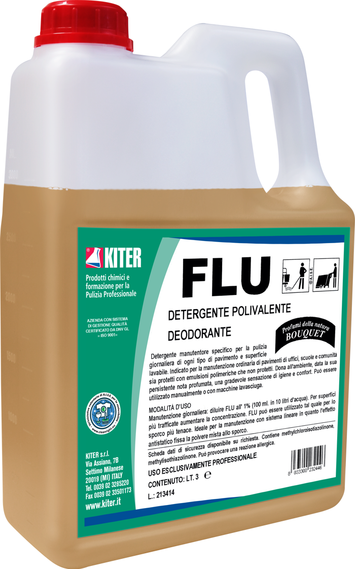 FLU BOUQUET è un detergente neutro brillantante a bassissimo residuo, ideale per la pulizia quotidiana di superfici dure lavabili. Indicato per pavimenti protetti e trattati, rilascia una persistente fragranza floreale. Non necessita di risciacquo, è adatto anche a lavasciuga e garantisce risultati ottimali senza accumuli. Prodotto professionale, conforme ai requisiti di biodegradabilità, ideale per ambienti che richiedono cura e igiene.