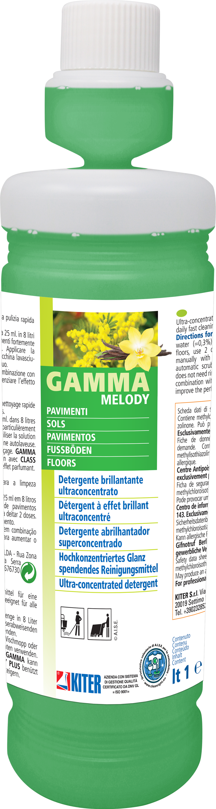 GAMMA è un detergente ultraconcentrato per la pulizia quotidiana di tutti i pavimenti. Dona agli ambienti una profumazione intensa e duratura di mimosa e vaniglia. La formula a pH neutro, senza bisogno di risciacquo, non lascia aloni né residui e può essere utilizzata anche con lavasciuga. Indicato per uso professionale, favorisce il risparmio di spazio e riduce gli sprechi. Consigliato in abbinamento a Class Melody Plus.