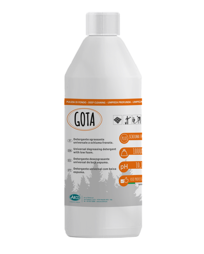 DETERGENTE SGRASSANTE UNIVERSALE GOTA e' un detergente ammoniacale che contiene saponi naturali, idoneo per la manutenzione ordinaria di piastrelle,vetri,infissi,superfici lavabili. Particolarmente indicato per la sua bassa formazione di schiuma all’impiego con lavasciuga e monospazzola.