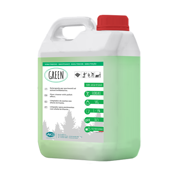 DETERGENTE BRILLANTANTE PROFUMATO ALLE ESSENZE FLOREALI Specifico per la pulizia ordinaria di pavimenti e di tutte le superfici lavabili. Particolarmente indicato per la manutenzione giornaliera di superfici lucide quali pavimenti in ceramica e lucidati a piombo. GREEN è il prodotto ideale per la manutenzione a umido di pavimenti protetti con emulsioni polimeriche. Lascia nell’ambiente un persistente profumo fresco dando sensazione di salubrità. Effetto antistatico.