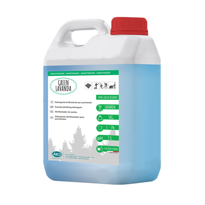 DETERGENTE BRILLANTANTE PROFUMATO ALLA LAVANDA Specifico per la pulizia ordinaria di pavimenti e di tutte le superfici lavabili. Particolarmente indicato per la manutenzione giornaliera di superfici lucide quali pavimenti in ceramica e lucidati a piombo. GREEN lavanda è il prodotto ideale per la manutenzione a umido di pavimenti protetti con emulsioni polimeriche. Lascia nell’ambiente un persistente profumo fresco dando sensazione di salubrità. Effetto antistatico.
