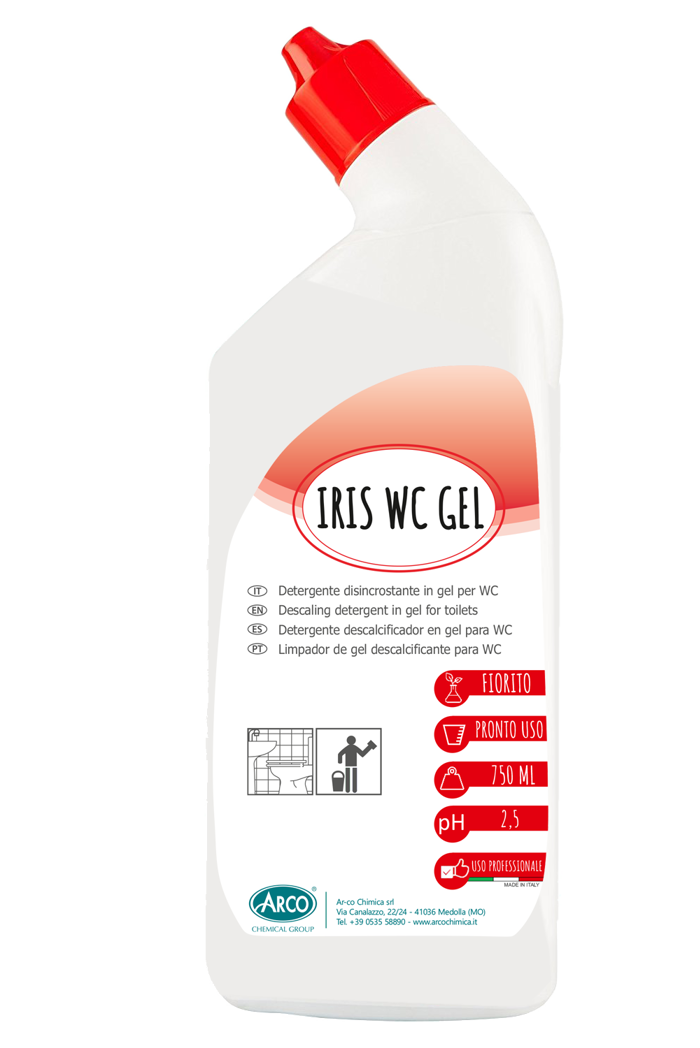 DETERGENTE ACIDO MANUTENTORE SANIFICANTE E DEODORANTE PER WC •IRIS WC GEL è un detergente deodorante con potere anticalcareo per consentire una rapida ed efficace pulizia di gabinetti e orinatoi. •IRIS WC GEL esplica una azione sanificante e deodorante in quanto contiene principi attivi che ne completano l’azione igienizzante. •IRIS WC GEL ha una perfetta aderenza alle pareti delle tazze WC data l’equlibrata viscosità.
