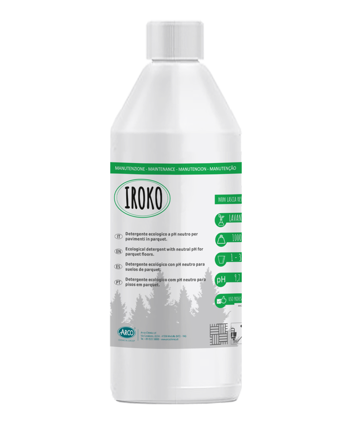DETERGENTE ECOLOGICO A BASSO RESIDUO PER PARQUET ALLA NOTA CAMPI DI LAVANDA IROKO e’ un detergente ecologico a PH neutro per la manutenzione quotidiana dei pavimenti in parquet. Grazie alla particolare formulazione IROKO si presenta come detergente a bassissimo impatto ambientale, bassa schiuma, con un notevole aumento della capacità bagnante e di contatto tra detergente e superficie trattata, evitando formazioni di residui ed aloni indesiderati. IROKO risulta idoneo anche per pavimenti in parquet trattati a cera.