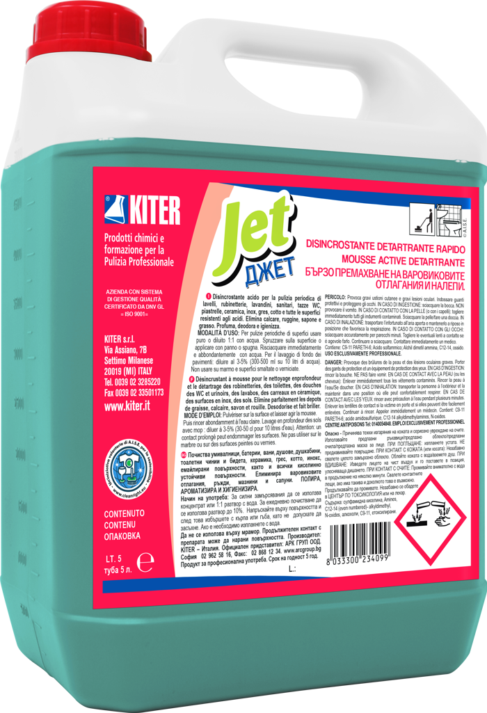 JET tanica lt. 5 è una schiuma disincrostante a base di acido solfammico, studiata per la manutenzione di lavelli, rubinetterie, sanitari, docce, pavimenti e pareti. Rimuove efficacemente calcare, depositi di ruggine, sapone e grasso, lasciando le superfici brillanti e pulite. La formula aderisce anche alle pareti verticali. Adatto solo a uso professionale. Evitare il contatto con marmo o superfici verniciate e utilizzare dispositivi di protezione.
