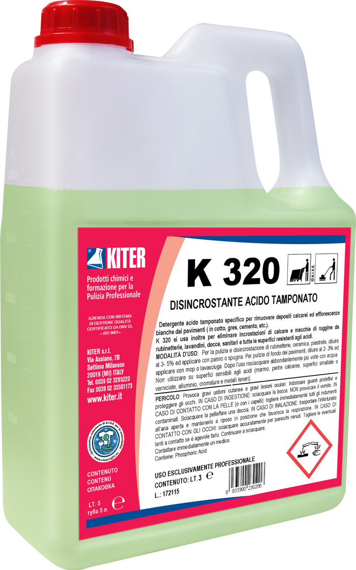 K320 è un disincrostante acido tamponato a base di acido fosforico, ideale per rimuovere calcare, calce, salnitro, cemento, gesso e ruggine da gres, ceramica, cotto, sanitari e piscine. Compatibile con pavimenti e superfici resistenti agli acidi, è adatto a uso manuale e con attrezzature professionali. Seguire le dosi indicate e le precauzioni di sicurezza. Formato tanica da 3 litri. Solo per uso professionale.