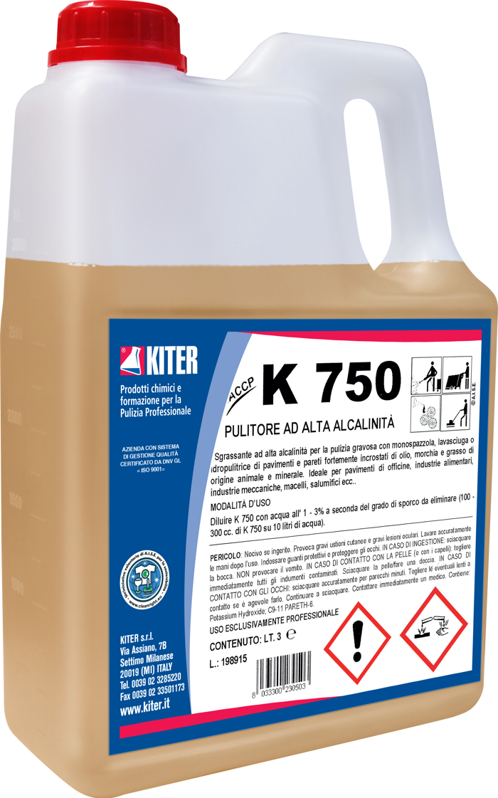 K750 è uno sgrassante a base fortemente alcalina, indicato per trattare incrostazioni difficili e morchie su pavimenti e pareti in ambienti industriali e officine. Scioglie rapidamente residui di grasso, olio e sporco tenace di origine animale, vegetale o minerale. Inodore e completamente solubile in acqua, questo prodotto si utilizza diluito e rispetta le normative di biodegradabilità per i tensioattivi. Per uso professionale.
