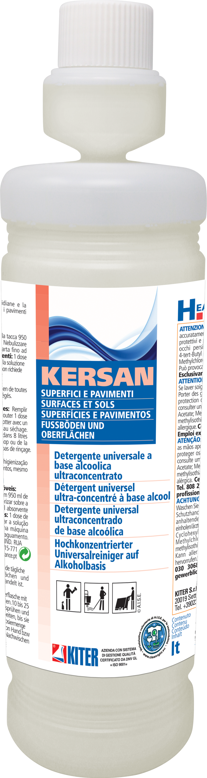 Kersan Flacone Dosatore 1L è un detergente neutro ultraconcentrato a base alcolica, ideale per tutte le superfici e pavimenti lavabili, sia opachi che lucidi. Assicura un’igiene completa, asciuga rapidamente senza lasciare residui e offre una profumazione persistente. È indicato anche su superfici a contatto frequente con le mani. Non richiede risciacquo, è a bassa schiuma e rispetta i criteri di biodegradabilità.
