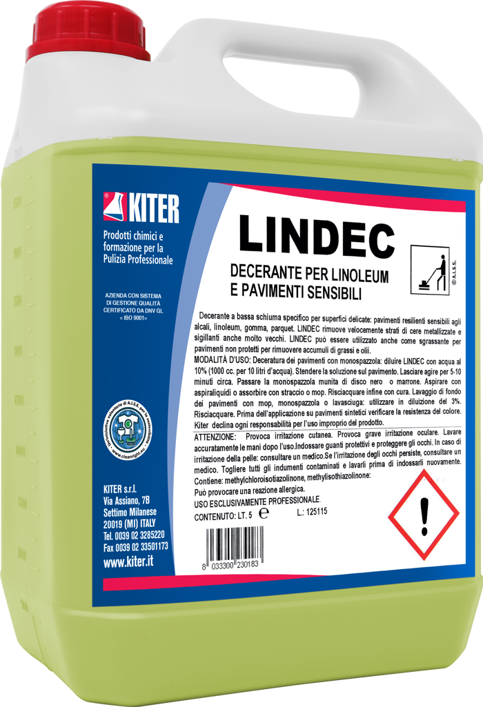 LINDEC è un decerante ad alta alcalinità a bassa schiuma, ideale per la rimozione efficace di qualsiasi tipo di cera e la pulizia di fondo su pavimenti delicati, tra cui linoleum, gomma e parquet. Adatto anche come sgrassante per lavasciuga, rimuove accumuli di oli e sigillanti. Prodotto destinato esclusivamente a uso professionale. Si consiglia l’uso di idonei dispositivi di protezione individuale durante l’impiego.