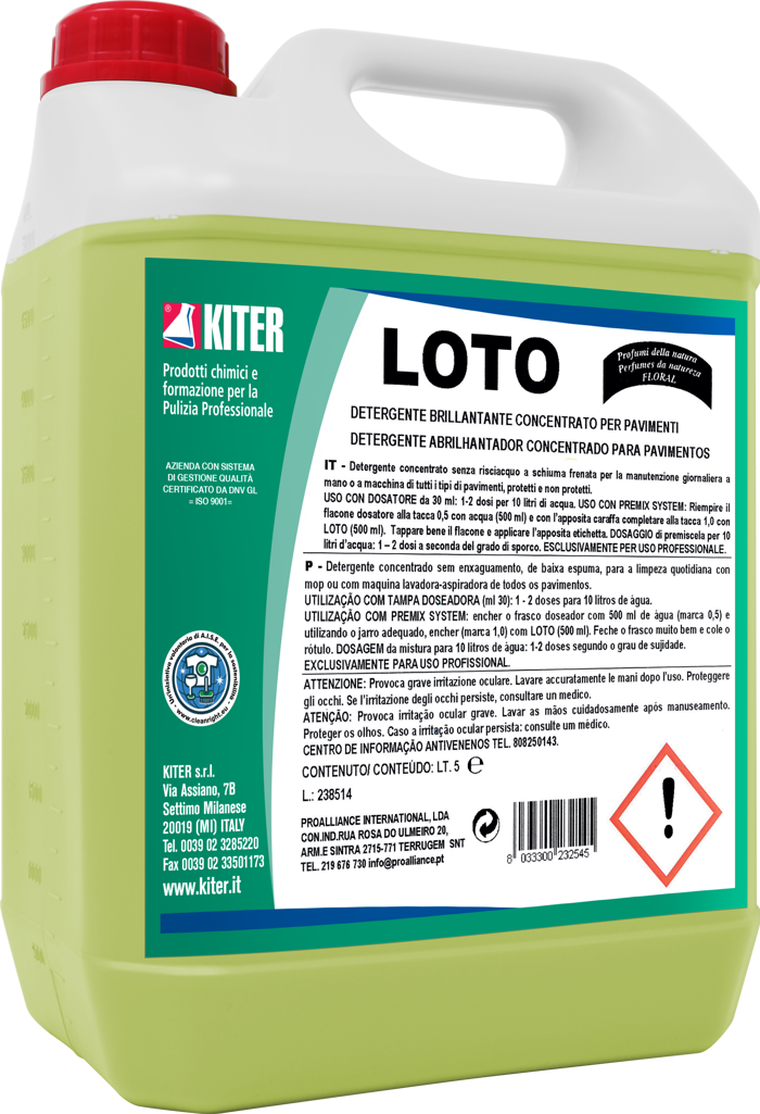LOTO tan.lt.5 è un detergente concentrato a bassa schiuma, adatto per la pulizia rapida di tutti i pavimenti duri lavabili. Garantisce superfici brillanti senza lasciare residui o aloni. Il profumo floreale dona freschezza agli ambienti. Ideale per uffici, scuole, hotel e comunità, può essere utilizzato con mop o lavasciuga, senza necessità di risciacquo. Indicato per uso professionale. Confezione da 5 litri.