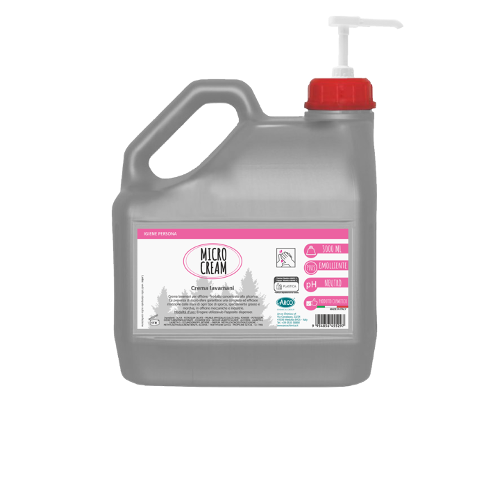 Microcream è una crema lavamani concentrata ideale per officine e industrie. Grazie alla glicerina e alle microsfere di polvere di guscio di mandorla, rimuove efficacemente sporco ostinato, grasso e morchia rispettando la pelle. Il formato tanica da 3 litri assicura un utilizzo duraturo, perfetto per l’uso professionale tramite dispenser. Prodotto Made in Italy, pratico e affidabile, garantisce igiene e pulizia profonda delle mani.
