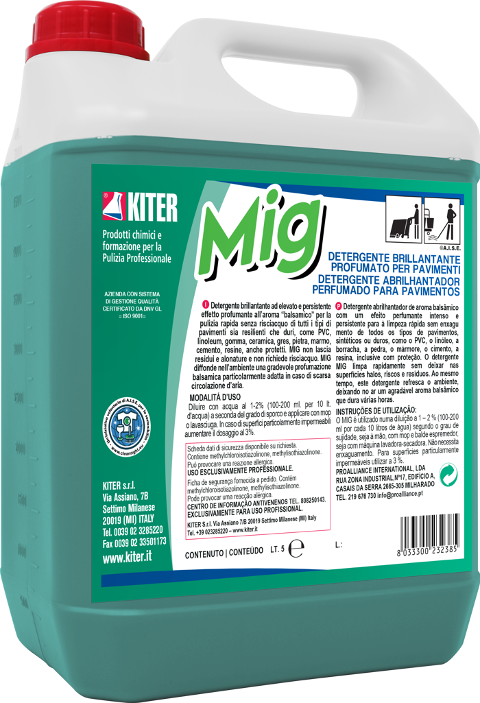 MIG è un detergente neutro per pavimenti duri dal profumo balsamico intenso e persistente. Studiato per un uso professionale, garantisce una pulizia approfondita senza risciacquo e non lascia aloni. A bassa schiumosità, rinfresca gli ambienti e abbatte i cattivi odori. È ideale per superfici come marmo, linoleum, pietra e PVC. Adatto in luoghi pubblici, scuole, uffici e palestre. Completamente solubile, rispetta la normativa vigente sulla biodegradabilità.