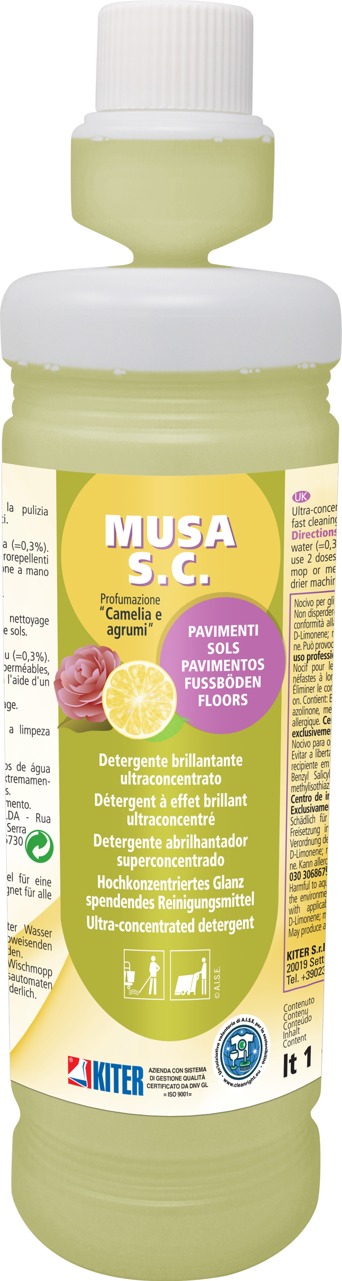 MUSA SC è un detergente ultraconcentrato studiato per la pulizia quotidiana di ogni tipo di pavimento. La sua formulazione pH neutro garantisce risultati senza aloni e residui, anche su superfici delicate come parquet, gres e marmo. Utilizzabile sia manualmente che con lavasciuga, non genera schiuma e offre una profumazione intensa di camelia e agrumi, persistente nel tempo. Riduce costi e sprechi grazie al dosaggio pratico. Per uso esclusivamente professionale.
