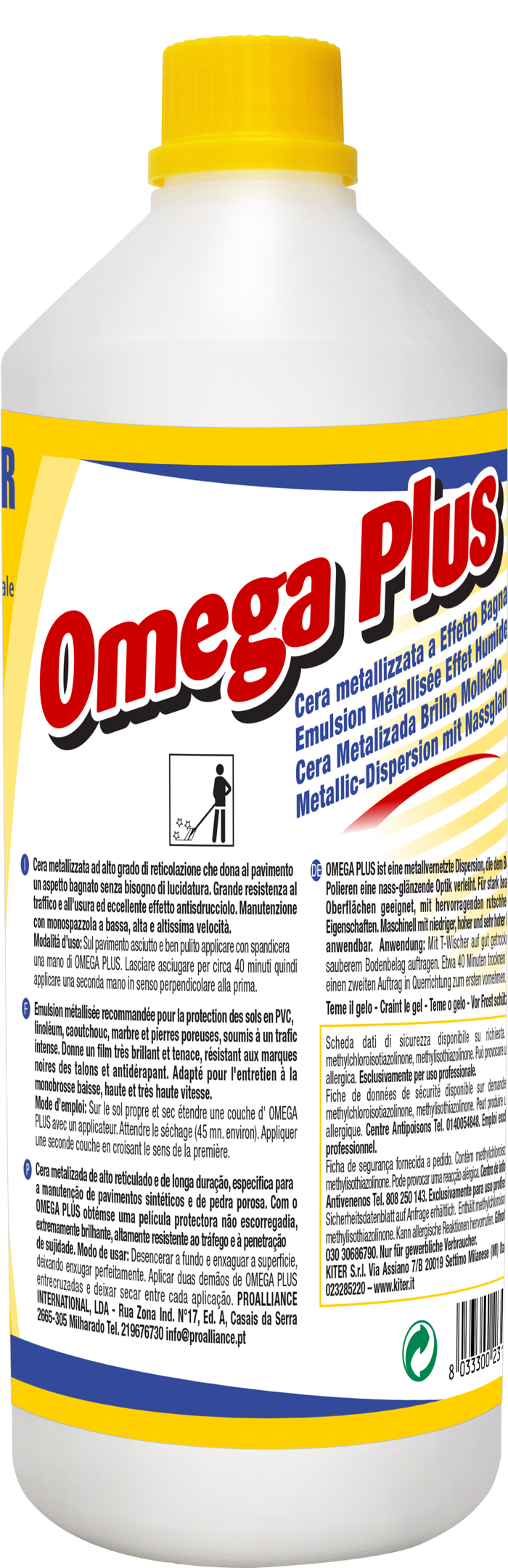 OMEGA PLUS è una cera metallizzata autolucidante ad alta resistenza, ideale per la protezione di pavimenti in gomma, PVC, linoleum, marmo e pietre naturali. Garantisce effetto bagnato immediato, superficie antiscivolo e pellicola durevole, facilmente manutenzionabile con macchine a varie velocità. Destinata all’uso professionale, lascia un film protettivo e ultralucido, senza alterare la conducibilità di pavimenti antistatici. Non indicata per uso domestico.