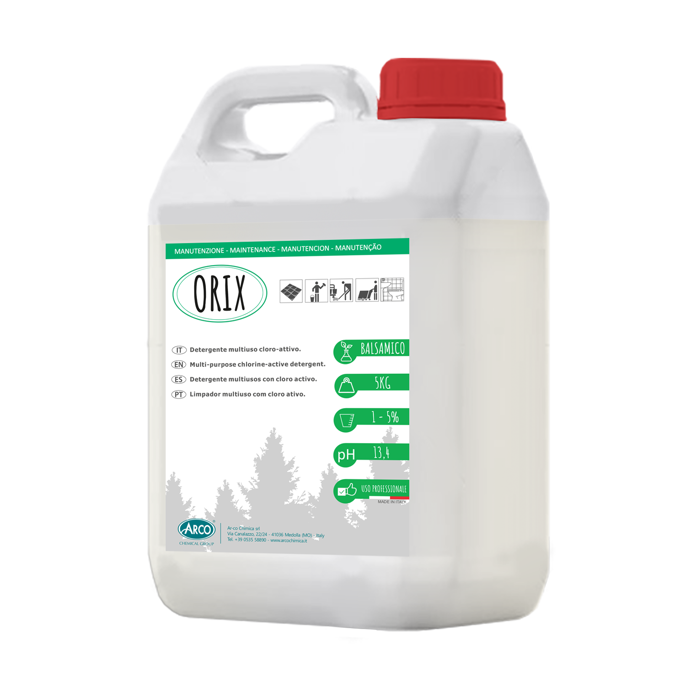 DETERGENTE MULTIUSO PROFUMATO AD AZIONE CANDEGGIANTE Orix è un detergente multiuso ad azione candeggiante idoneo per la pulizia di manutenzione di superfici dure. Particolarmente adatto al trattamento di pavimenti, piastrelle, superfici in maiolica e servizi igienici. Idoneo per la pulizia di lavelli, vasche da bagno, bidet e l’interno della tazza wc L’elevata capacità ossidante dell’ipoclorito di sodio assieme ai preposti tensioattivi anfoteri conferiscono al prodotto una particolare adattabilità a vari tipi di sporco, rendendolo utile per la pulizia quotidiana e l’igienizzazione delle superfici dure. Orix è caratterizzato da una gradevole nota balsamica/canforata.