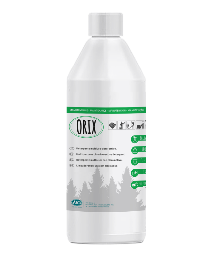 DETERGENTE MULTIUSO PROFUMATO AD AZIONE CANDEGGIANTE Orix è un detergente multiuso ad azione candeggiante idoneo per la pulizia di manutenzione di superfici dure. Particolarmente adatto al trattamento di pavimenti, piastrelle, superfici in maiolica e servizi igienici. Idoneo per la pulizia di lavelli, vasche da bagno, bidet e l’interno della tazza wc L’elevata capacità ossidante dell’ipoclorito di sodio assieme ai preposti tensioattivi anfoteri conferiscono al prodotto una particolare adattabilità a vari tipi di sporco, rendendolo utile per la pulizia quotidiana e l’igienizzazione delle superfici dure. Orix è caratterizzato da una gradevole nota balsamica/canforata.