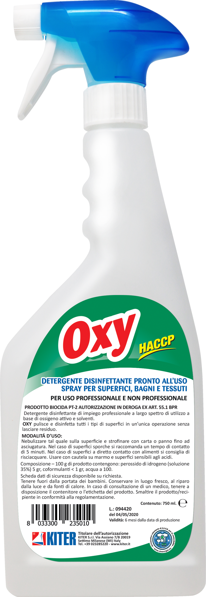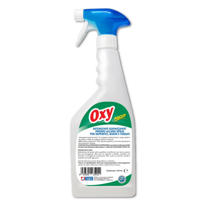 Detergente igienizzante pronto all'uso spray per superfici e tessuti a base di perossido d'idrogeno.