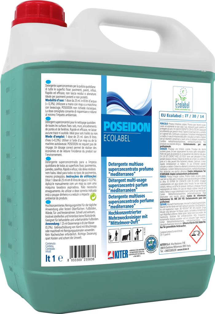 DETERGENTE SUPERCONCENTRATO ECOLABEL AD ELEVATO POTERE PULENTE SENZA RISCIACQUO A BASSA SCHIUMA PER TUTTI I PAVIMENTI DURI LAVABILI PROTETTI E NON. PROFUMO "MEDITERRANEO"