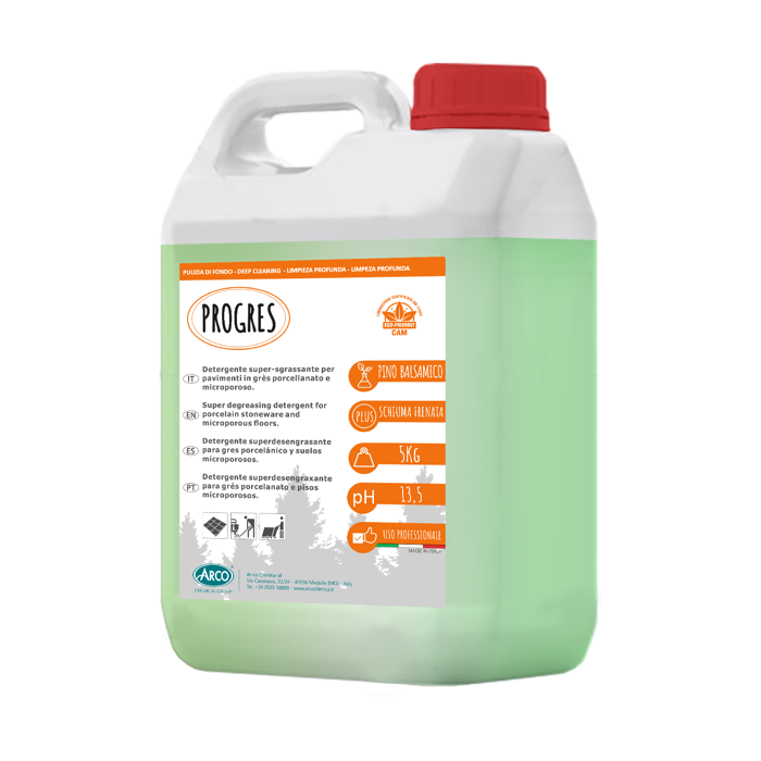 DETERGENTE SUPERSGRASSANTE PER GRES PORCELLANATO E MICROPOROSO PROGRES e’ un super sgrassante a schiuma controllata indicato per pavimenti in grès porcellanato e microporoso. PROGRES rimuove con facilità lo sporco grasso organico e minerale anche vecchio, pulendo e sbiancando la mattonella anche in profondità . La manutenzione giornaliera consente di mantenere il colore originale del grès porcellanato impedendone l’ingrigimento.