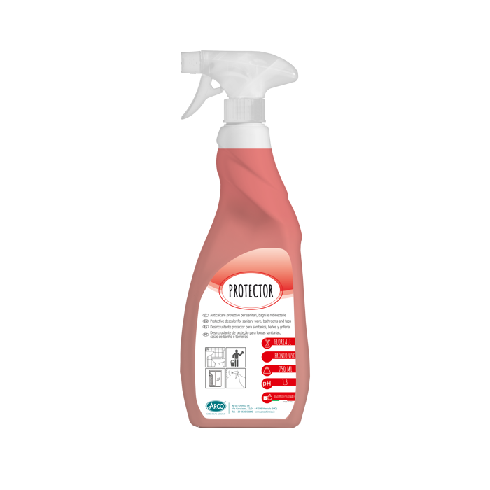 DETERGENTE DISINCROSTANTE PER SANITARI CON FORMULA PROTETTIVA PROTECTOR è un detergente a forte azione e a base acida, gradevolmente profumato. Particolarmente indicato per l’eliminazione di vecchi strati di calcare. PROTECTOR , grazie alla nuova formula protettiva, ritarda la formazione di sporco e calcare, lasciando una pellicola protettiva, idrorepellente sia sulle superfici che sulle rubinetterie proteggendole più a lungo. PROTECTOR riduce i tempi di lavoro e, grazie ai suoi nuovi componenti, protegge le mani dagli acidi.