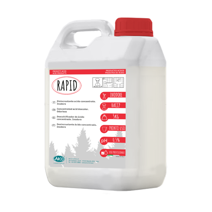 DISINCROSTANTE A BASE DI ACIDO FOSFORICO INODORE RAPID e' un detergente, inodore, a base di acido fosforico e agenti sequestranti, ideale per l’eliminazione dello sporco di tipo calcareo - organico lasciate dall’acqua e da sostanze di natura amidacea. •RAPID è ideale per la disincrostazione delle macchine da caffe’, sanitari in genere e inoltre risulta idoneo nelle cucine per l’eliminazione di incrostazioni da latte su pentolame in inox e alluminio .
