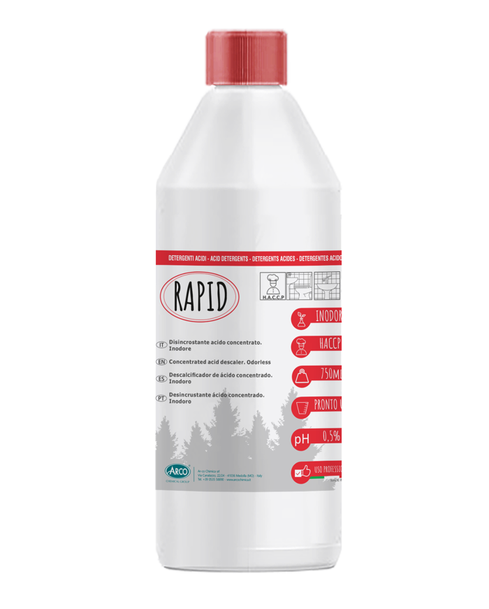 DISINCROSTANTE A BASE DI ACIDO FOSFORICO INODORE RAPID e' un detergente, inodore, a base di acido fosforico e agenti sequestranti, ideale per l’eliminazione dello sporco di tipo calcareo - organico lasciate dall’acqua e da sostanze di natura amidacea. •RAPID è ideale per la disincrostazione delle macchine da caffe’, sanitari in genere e inoltre risulta idoneo nelle cucine per l’eliminazione di incrostazioni da latte su pentolame in inox e alluminio .