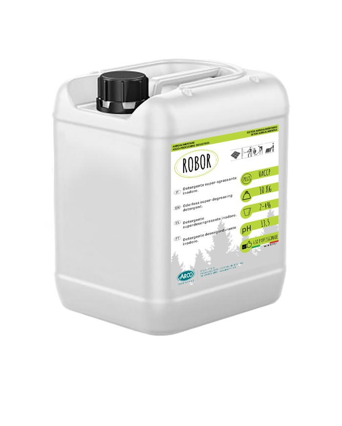 DETERGENTE ALCALINO A SCHIUMA FRENATA PER IL LAVAGGIO DI SUPERFICI SPORCHE DI GRASSI ORGANICI E ALIMENTARI.ROBOR TROVA IMPIEGO NELL'INDUSTRIA DELLA MACELLAZIONE DELLE CARNI,NEI CASEIFICI E NELL'INDUSTRIA ALIMENTARE.