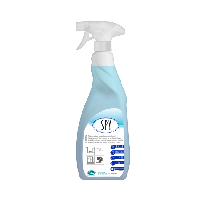 DETERGENTE AUTOASCIUGANTE BRILLANTANTE PER VETRI E SPECCHI SPY è un detergente auto asciugante ideale per la pulizia giornaliera di vetri, specchi e cristalli. Senza lasciare tracce di alonature sulle superfici. SPY inoltre è ideale per la spolveratura di superfici laccate o di mobilio in generale. SPY ha una profumazione alla nota floreale.
