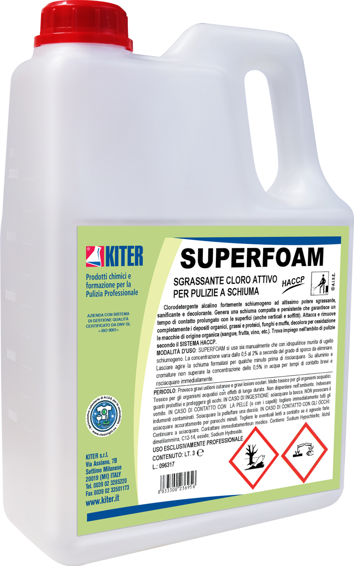 SCHIUMA SGRASSANTE CLOROATTIVA PER LA PULIZIA DI FONDO, LA SANIFICAZIONE E LA DECOLORAZIONE NELL'INDUSTRIA ALIMENTARE. SPECIFICO PER LA RIMOZIONE DA PARETI, PAVIMENTI E SOFFITTI ACCUMULI DI GRASSO, SANGUE, MUFFE, RESIDUI DI CARNI E ZUCCHERI NELL'AMBITO DI PROGRAMMI SECONDO IL SISTEMA HACCP. UTILIZZATO NELLE INDUSTRIE PER LA LAVORAZIONE DELLE CARNI, DELL'IMBOTTIGLIAMENTO, ENOLOGICHE, MACELLI, ESERCIZI DI DISTRIBUZIONE ALIMENTARE.