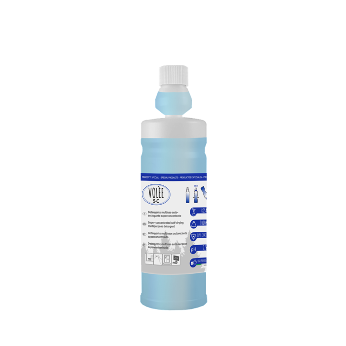 DETERGENTE CONCENTRATO MULTIUSO AUTOASCIUGANTE VOLÉE 5-C CONCENTRATO MULTIUSO SUPERFICI DURE è un pulitore rapido multiuso per la manutenzione giornaliera di superfici quali scrivanie,banchi di scuola,vetri, specchi, porte e superfici laminate e laccate in genere. Elimina aloni ed untuosità insieme a segni di biro, matita, timbri, colori e pennarelli. Può essere utilizzato anche su superfici metalliche quali ottone, ghisa, cromature, acciai ed alluminio. Gradevole profumazione alla ROSA ESOTICA. Non necessita risciacquo.